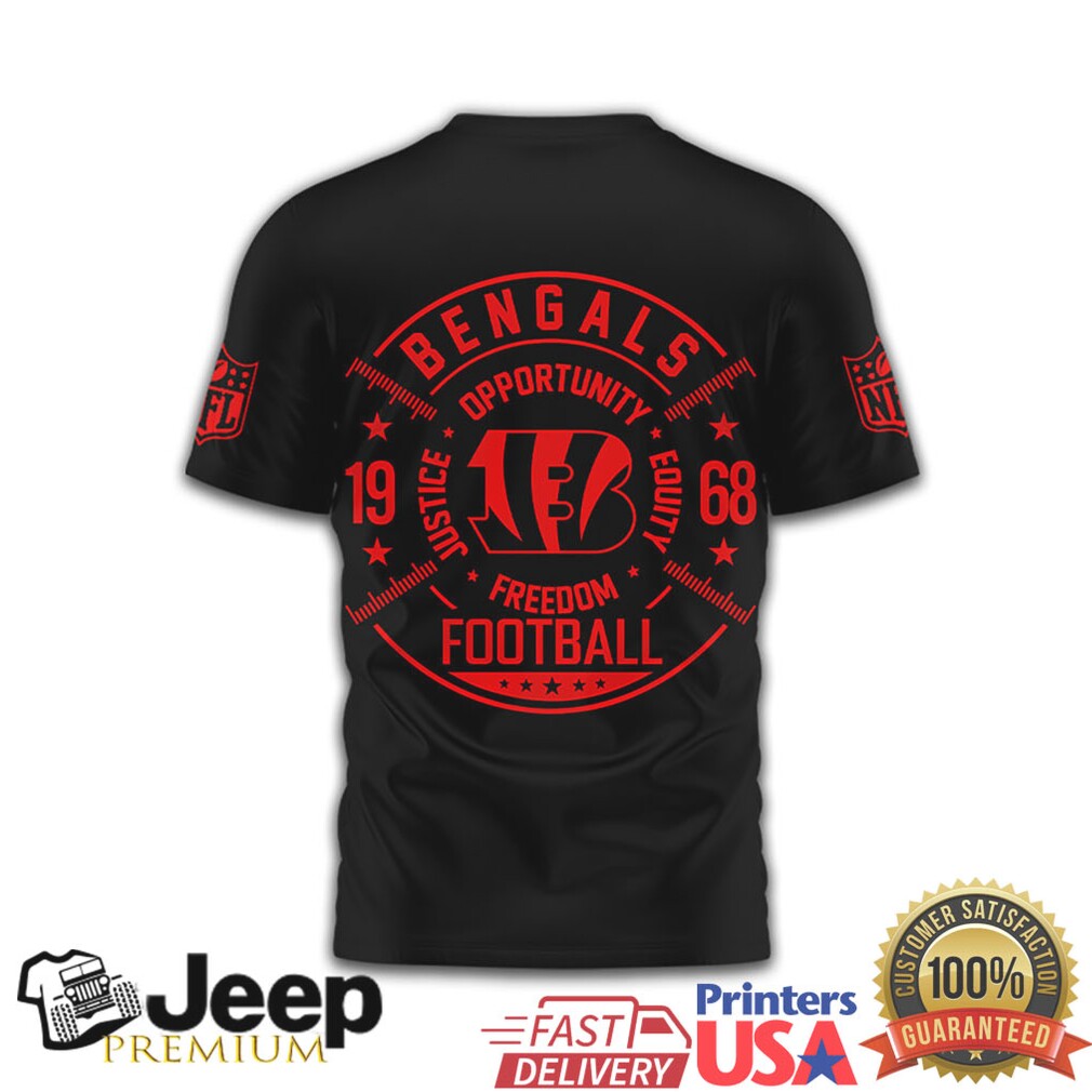 (Cincinnati Bengals Freedom Opportunity Justice Equity Football Black T Shirt)Australian Rules Football stands as a unique example of how a sport can shape the modern model of community-based athletic organizations. Created by colonials in Australia, it pioneered the concept of suburban football clubs where local players competed in structured leagues for a seasonal premiership. At a time when physical activity was largely restricted to school exercise programs, this model brought sports into the heart of the community. Today, it remains the most popular sport per head of population in Australia and ranks remarkably high in average game attendance globally. The game is celebrated for being exceptionally fast-paced, free-flowing, and physical, characterized by long kicking, high-speed sprints, and the spectacular “marking” or catching of the ball. This evolution from a localized colonial pastime to a major Cincinnati Bengals Freedom Opportunity Justice Equity Football Black T Shirt illustrates the power of sport to foster deep-rooted group identity and provide a centerpiece for social gathering, even as it maintains its reputation as one of the most physically demanding team sports in existence.