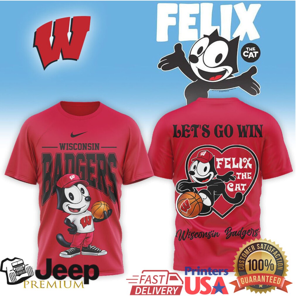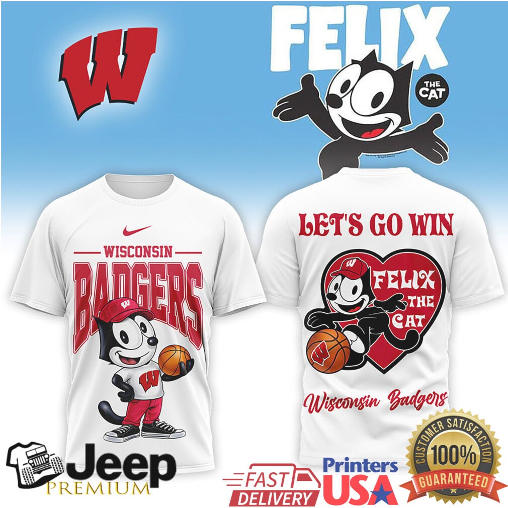 On Wisconsin! The Badgers get a fun new look in this Felix the Cat crossover basketball tee. Perfect for UW Madison fans who want to add a little classic cartoon fun to their game day ensemble, this shirt blends Badger nation pride with the timeless charm of Felix the Cat. A great gift for students, alumni, and lifelong fans of Wisconsin basketball.
