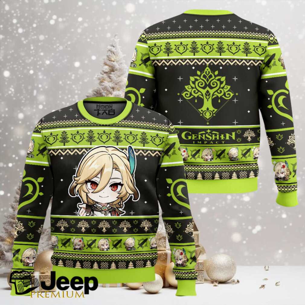 This Kaveh Ugly Christmas Sweater is a fantastic choice for Genshin Impact players, especially those who appreciate Kaveh’s character and Sumeru’s vibrant culture. It’s an ideal gift for anime enthusiasts, gamers, or anyone looking for a unique and cozy piece of holiday apparel. Wear it to themed parties, casual get-togethers, or simply when you want to feel festive and connected to your favorite game. The second image provides a closer look at the intricate and fun design.With each Genshin Impact Kaveh Ugly Christmas Sweater, you are contributing to creating a green tree.