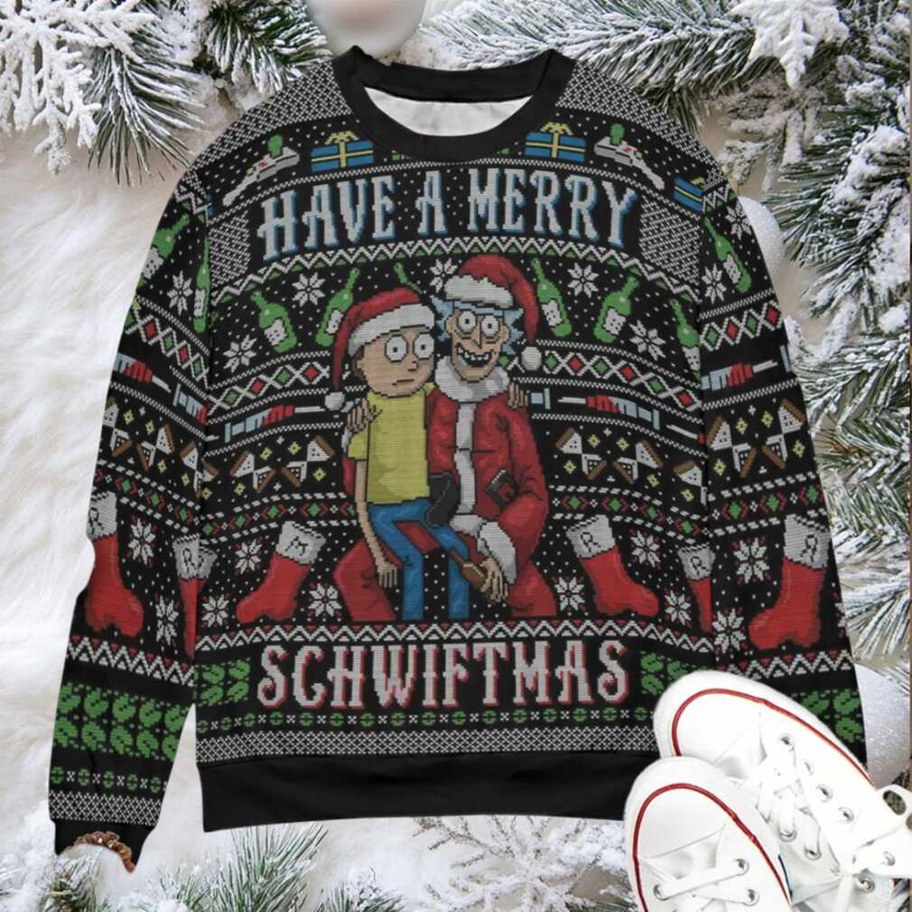 Get ready to infuse your holiday season with some interdimensional mischief and a whole lot of laughs with the “Have A Merry Schwiftmas Ugly Christmas Sweatshirt.” If you’re a true fan of Rick and Morty and believe Christmas should be anything but boring, this is the perfect way to show off your love for the show while celebrating the festive cheer. It’s a fun twist on traditional holiday apparel that will definitely get people talking.