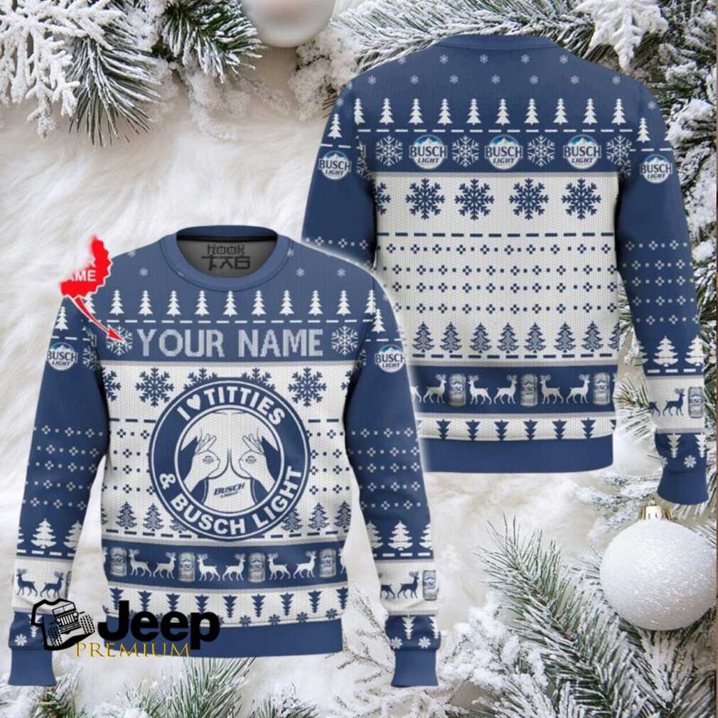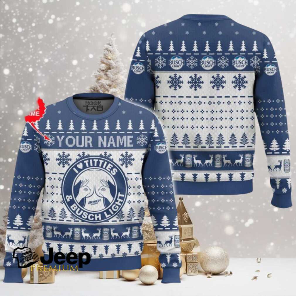 With each I Love Titties And Busch Light Custom Name Ugly Christmas Sweater, you are contributing to creating a green tree. To keep your personalized sweater in excellent condition, machine wash it cold with similar colors. Tumble dry on a low setting and avoid ironing directly on the design to preserve its unique charm for many festive seasons.