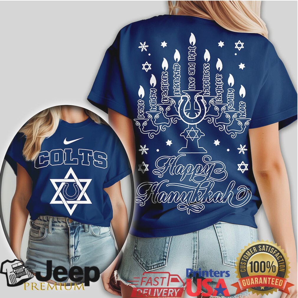Colts fans, Happy Hanukkah! This festive tee features a menorah and Star of David in Indianapolis Colts blue and white, the perfect holiday shirt for Jewish Colts fans looking to celebrate in true team spirit.