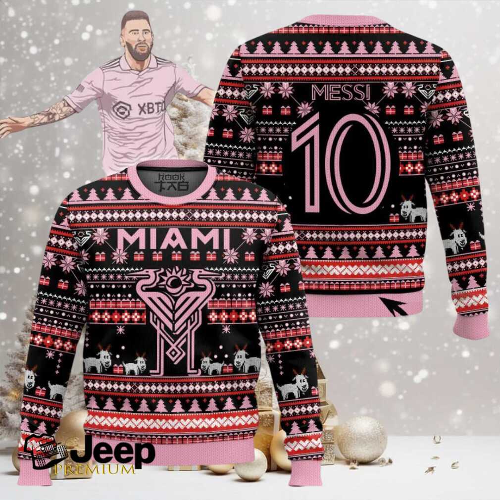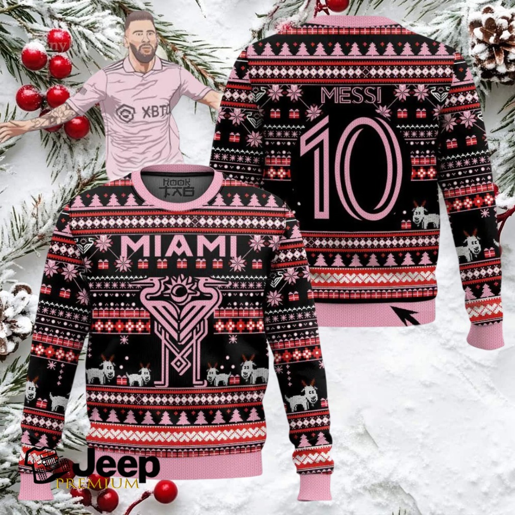 Score a holiday win with this Inter Miami “Goat Edition” ugly Christmas sweater! Featuring the iconic Inter Miami colors and the option to customize with your own name and number, this sweater is a must-have for any fan of the team or the legendary Messi. It’s the perfect way to celebrate the holidays and show your support for your favorite soccer club.