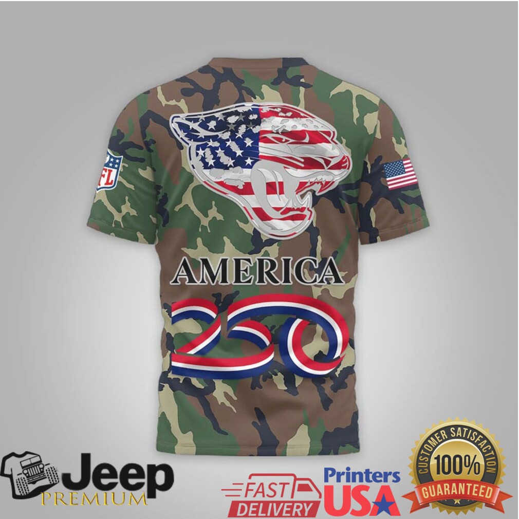 Celebrate America’s 250th anniversary in style with this Jacksonville Jaguars NFL Camo tee. Blending patriotic camo print with official Jacksonville Jaguars team colors and graphics, this shirt is a bold statement of team pride and American spirit. Ideal for Veterans Day, Independence Day, or any game day. Made with quality materials for lasting comfort. A collector’s item for patriotic NFL fans.