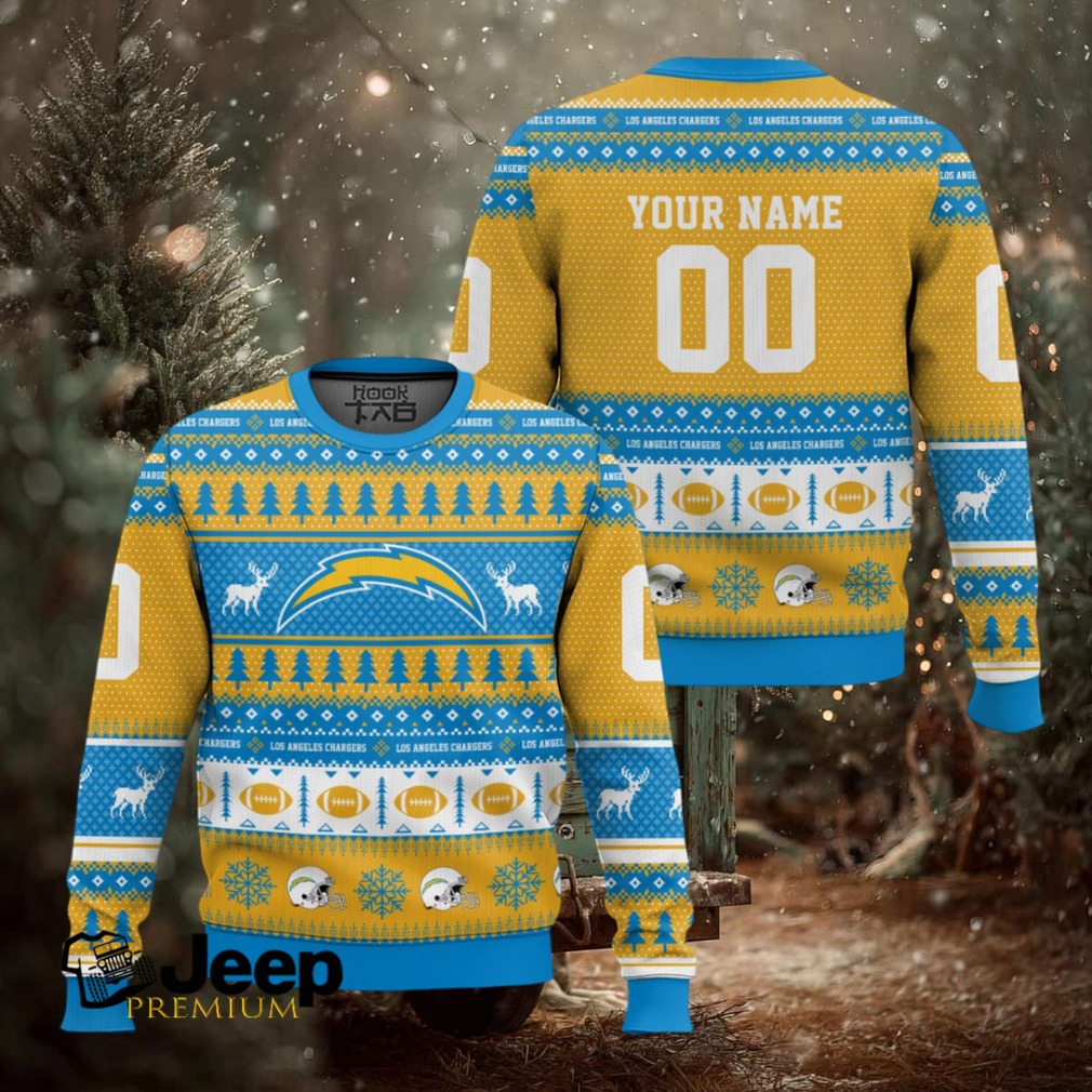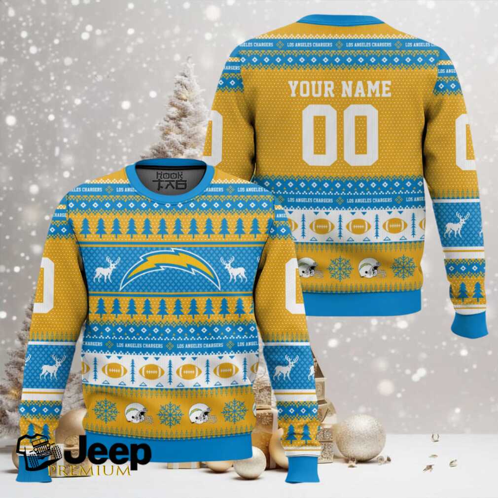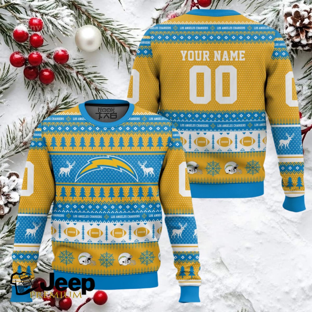 👕 About Los Angeles Chargers – Custom Name And Number Ugly Sweater