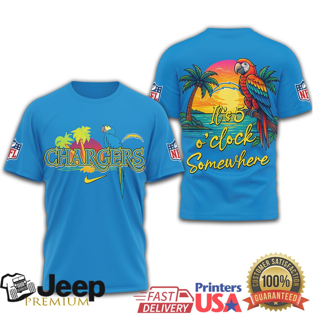 The Steelers have spent the last two seasons living in the short-term world of mercenary solutions at the game’s most important position. While Aaron Rodgers could be convinced to return for one more season under a coach he knows intimately in Mike McCarthy, it’s also time for Pittsburgh to commit to a plan with a longer runway. Green Bay snagged Willis in a low-buzz trade with the Titans in 2024 and did an exceptional job of cultivating his talents and transforming him into a plus backup with starter potential. Although his sample size is limited, Willis’ appearances have proven he can succeed in Los Angeles Chargers NFL Beach Sunset It’s 5 O’Clock Somewhere Shirt tailored to his strengths. He also did himself a huge favor by delivering the best outing of his career in a Saturday night showdown against Baltimore, producing a transcendent performance that landed him on the radars of those who never contemplated his existence prior. Pittsburgh is the ideal fit because Khan likely won’t be fooled into a bidding war but can present an enticing pitch to the Liberty product.