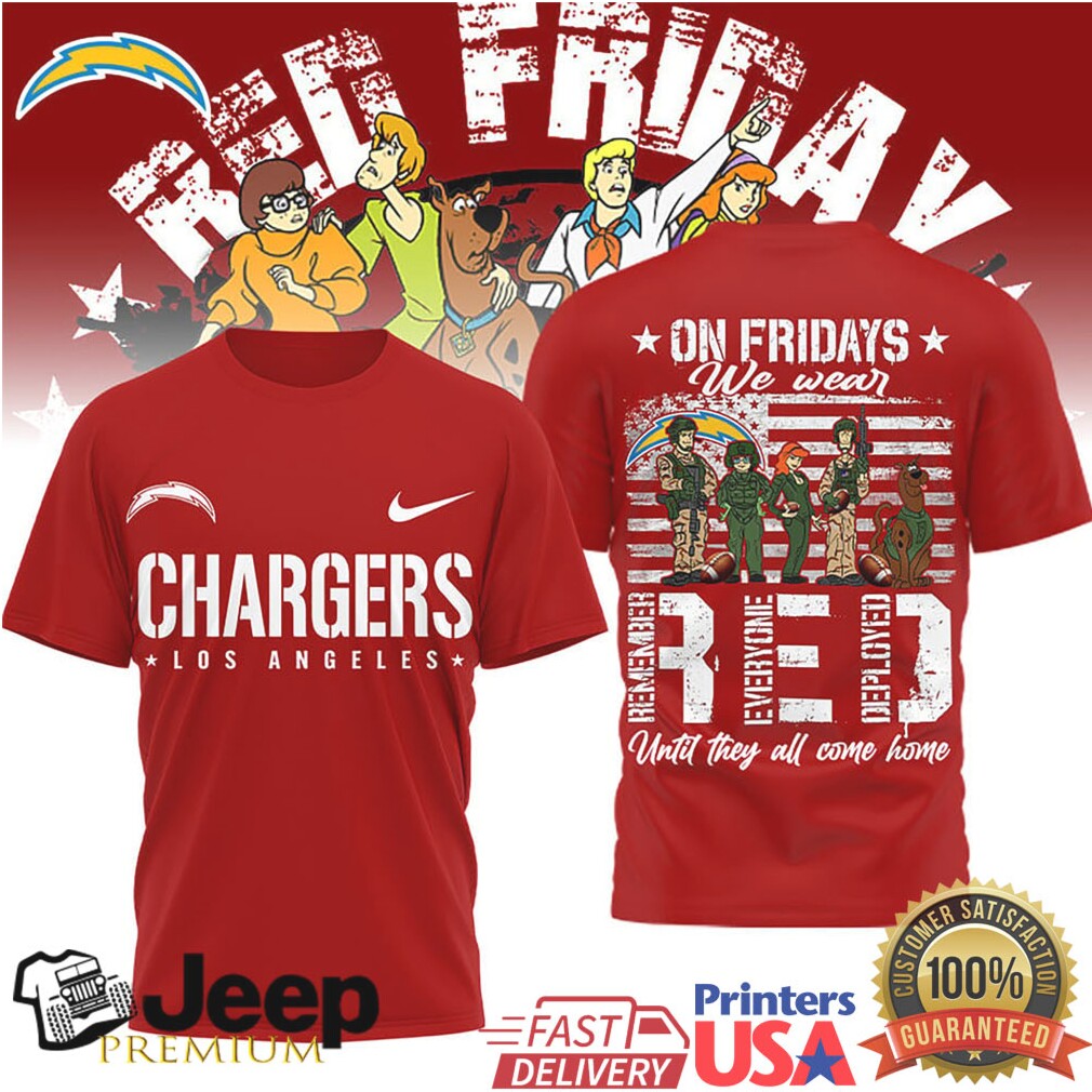 Honor our heroes every Friday with this Los Angeles Chargers R.E.D. Friday T-Shirt — Remember Everyone Deployed. Show your support for the brave men and women serving in the U.S. military while repping your favorite team. Bold red design with patriotic messaging. Perfect for veterans, military families, and proud American football fans alike.
