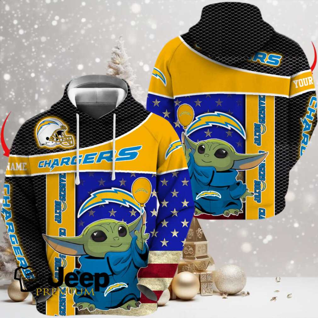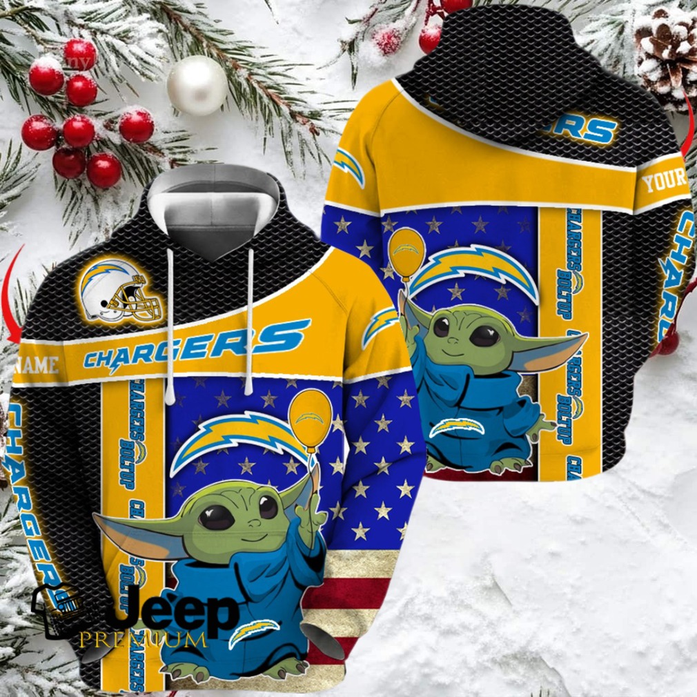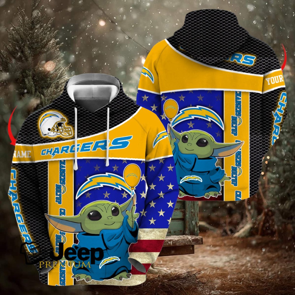 👕 About Los Angeles Chargers x Baby Yoda Holding Baloon Football Hoodie 3D Custom Name