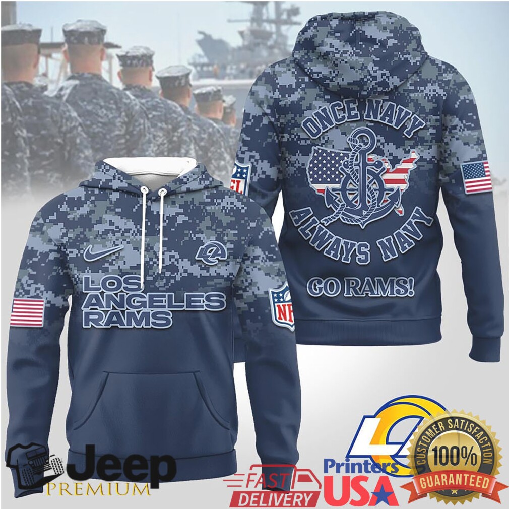 Picture yourself at the heart of the action, the crowd roaring, and your team, the Los Angeles Rams, making history. How do you show that unwavering spirit and pride? Not with just any fan gear, but with something that truly stands out. This isn’t merely a hoodie; it’s a statement piece that blends your passion for the Rams with a respectful nod to the US Navy, crafted for fans who appreciate unique style and comfort.