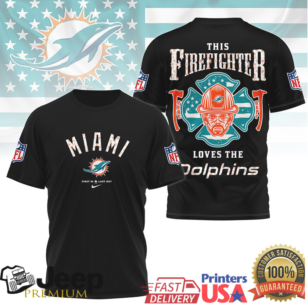 (Miami Dolphins Firefighter “First In Last Out” Proud Hero Tshirt)Miami Dolphins Firefighter “First In Last Out” Proud Hero Tshirt, Treat yourself or make a great gift for your loved ones