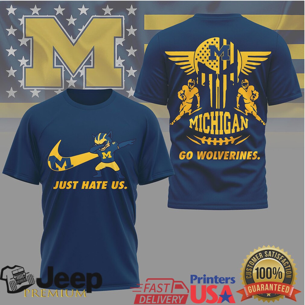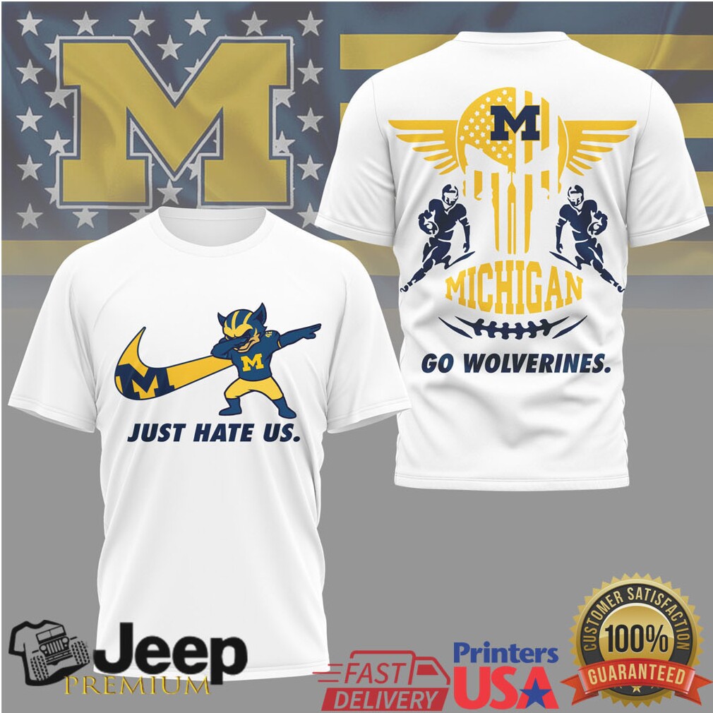 (Michigan Wolverines Just Hate Us Punisher Skull Football Graphic T Shirt)