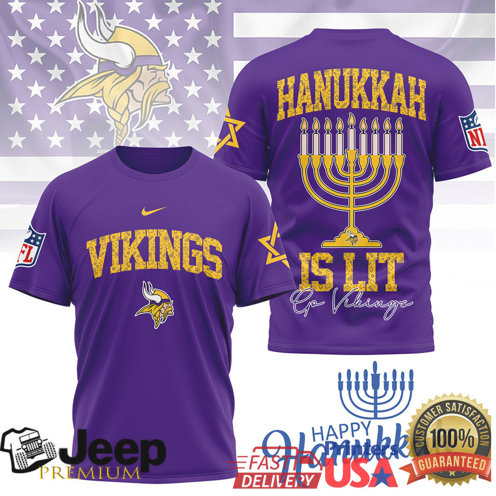 Skol Vikings and Happy Hanukkah! This festive tee features a bright menorah graphic in Vikings purple and gold, perfect for Minnesota fans celebrating the eight nights of Hanukkah in team spirit.
