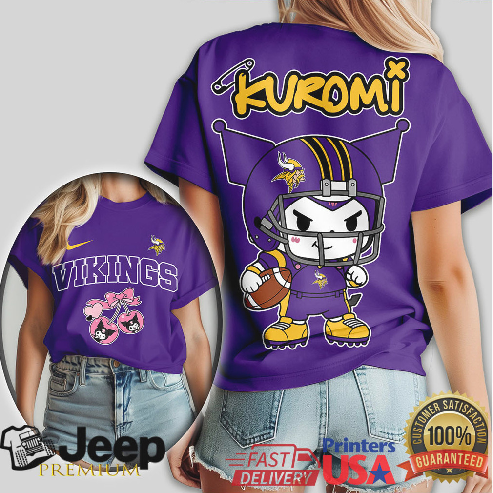 Skol Kawaii! This Minnesota Vikings x Kuromi tee features Sanrio’s beloved character in Vikings purple and gold, perfect for female Vikings fans who love adorable kawaii-style NFL apparel.