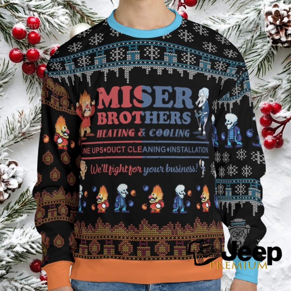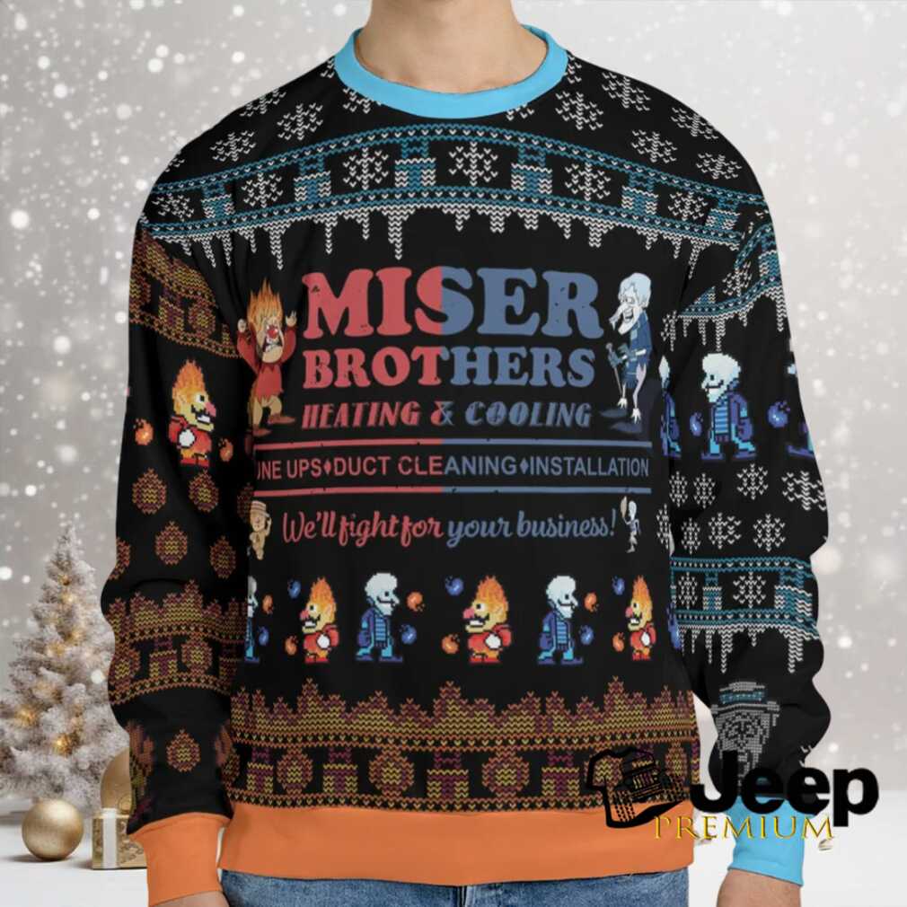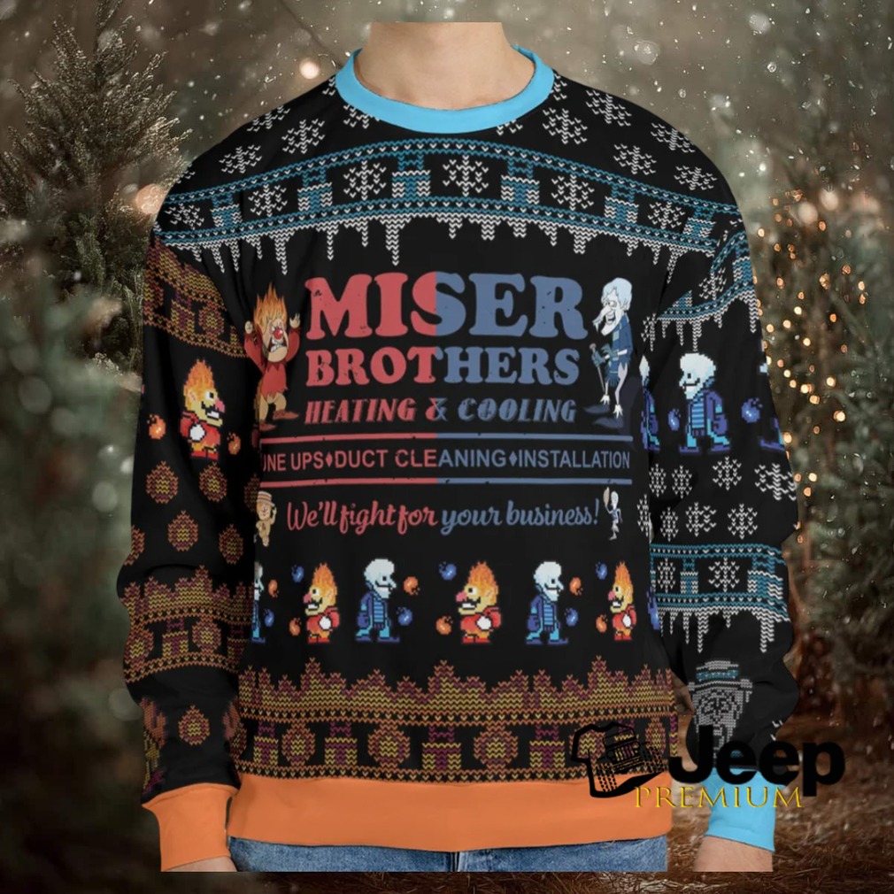 Get ready to debate whether you prefer a little heat or a lot of snow with this “Miser Brothers Ugly Christmas Sweatshirt”! Featuring the iconic duo, Snow Miser and Heat Miser, this festive design is a fantastic nod to a beloved holiday classic. It’s the perfect way to bring some nostalgic cheer and playful rivalry to your holiday celebrations.