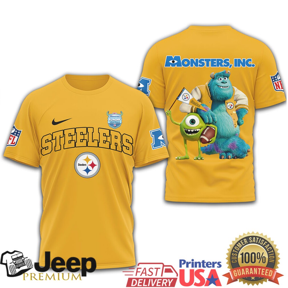 Show your Pittsburgh Steelers pride in a whole new way with this eye-catching Monsters Inc. x Pittsburgh Steelers crossover tee! Featuring fan-favorite characters Sulley and Mike Wazowski decked out in Pittsburgh Steelers team colors, this graphic t-shirt is the ultimate fusion of NFL spirit and Disney·Pixar magic. Perfect for game day, casual wear, or gifting to the superfan in your life. Made from soft, comfortable fabric — wear it loud and wear it proud!