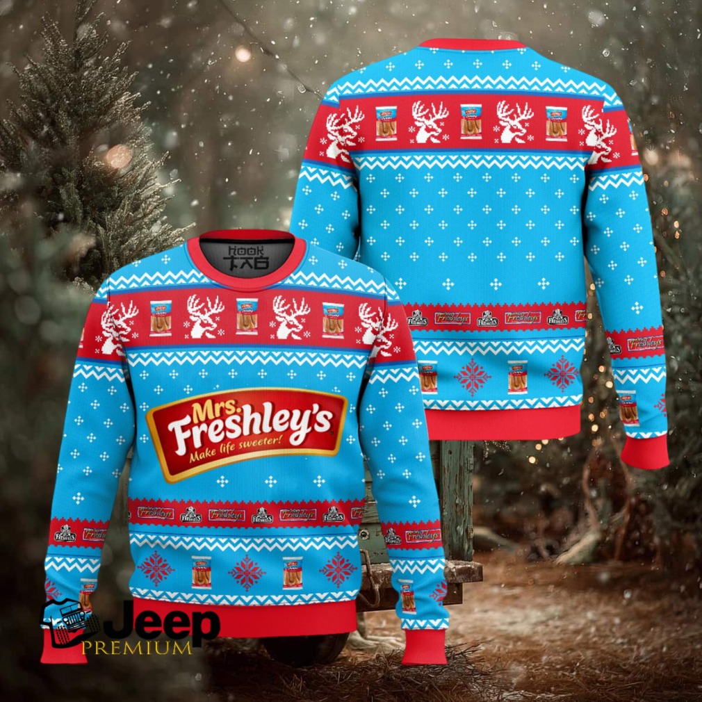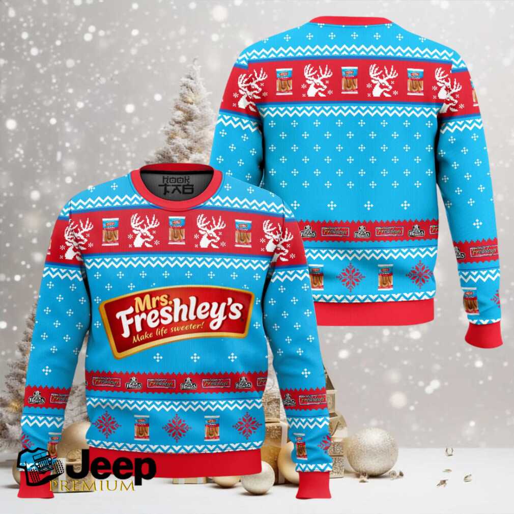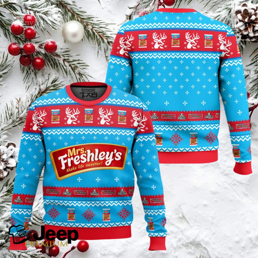 This sweater is perfect for Mrs. Freshley’s fans, lovers of quirky and humorous clothing, and anyone who wants to stand out at a holiday event. Ideal for Christmas parties, casual get-togethers, or just lounging around the house with your favorite snacks. It’s also a fantastic gift for the Mrs. Freshley’s obsessed friend or family member in your life!