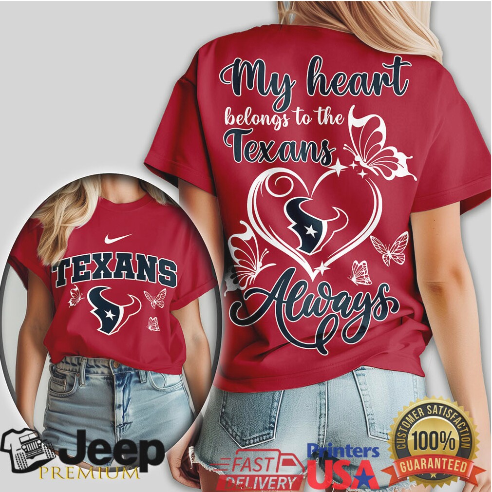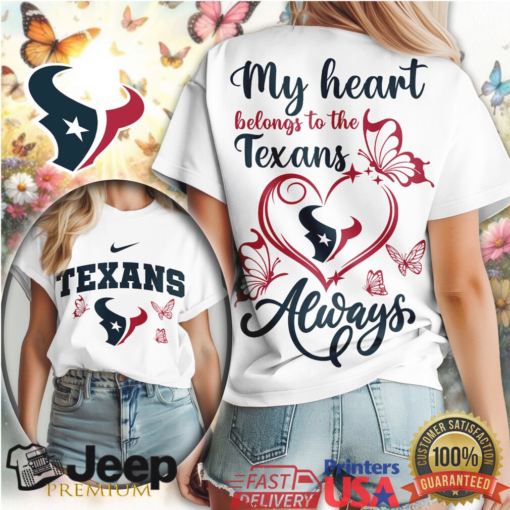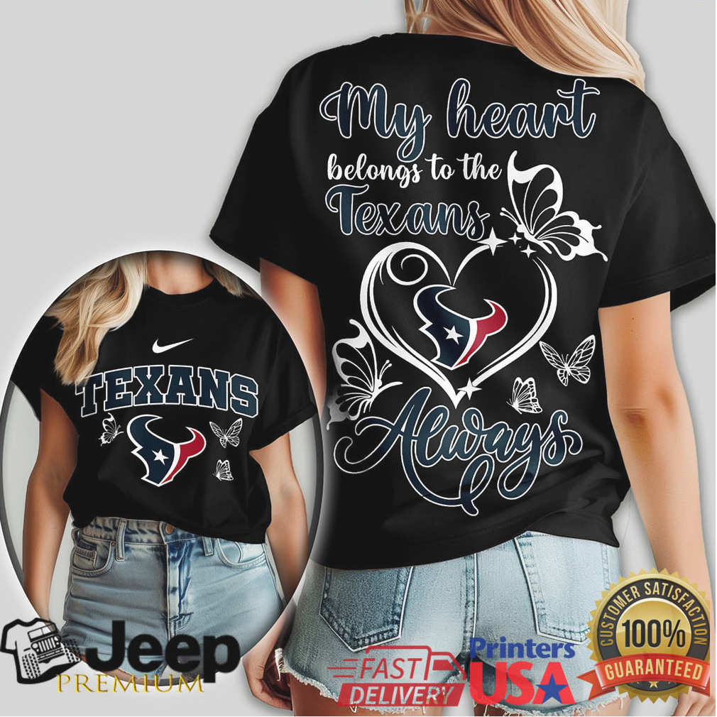Deep in the heart of Texas — it’s all Texans! This Houston Texans fan tee proclaims ‘My Heart Belongs to the Texans Always’ with the kind of H-Town pride that never quits. A perfect gift for die-hard Texans fans from the Lone Star State.