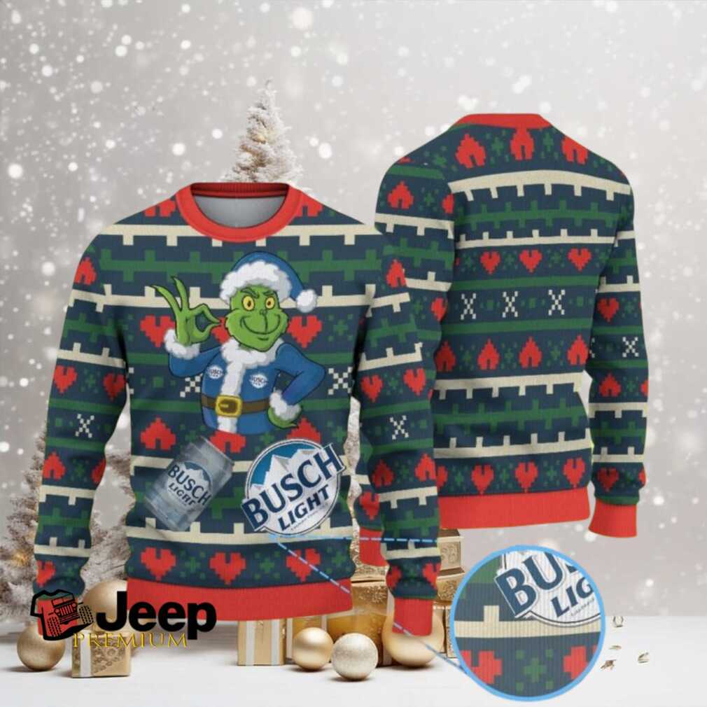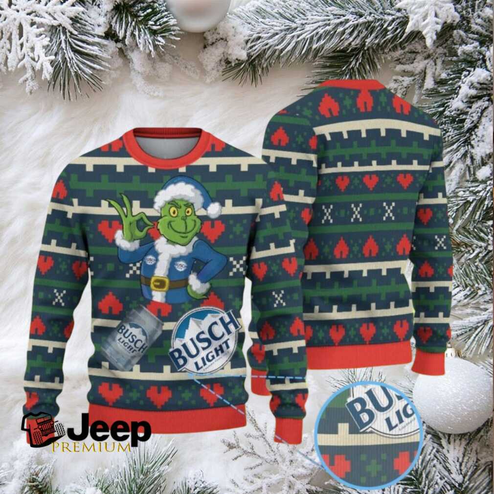 π About Navy Blue and Green Ugly Christmas Sweater with Red Heart Pattern, Grinch in Santa Suit and Busch Light Beer Design.jfif