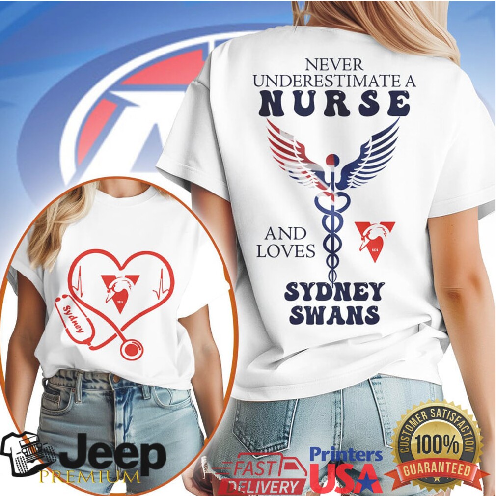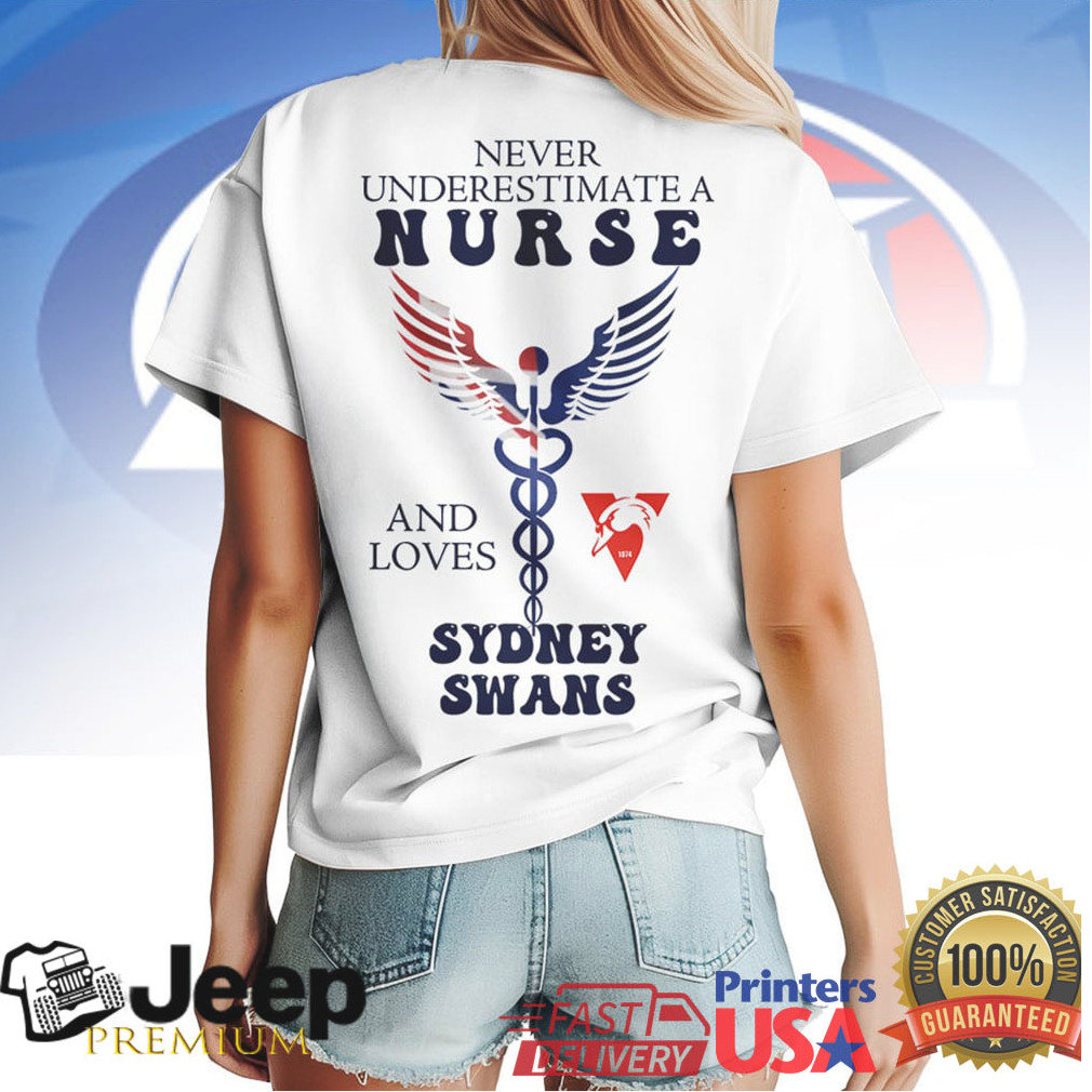 (Never Underestimate A Nurse And Loves Sydney Swans AFL T Shirt)Never Underestimate A Nurse And Loves Sydney Swans AFL T Shirt, Treat yourself or make a great gift for your loved ones
