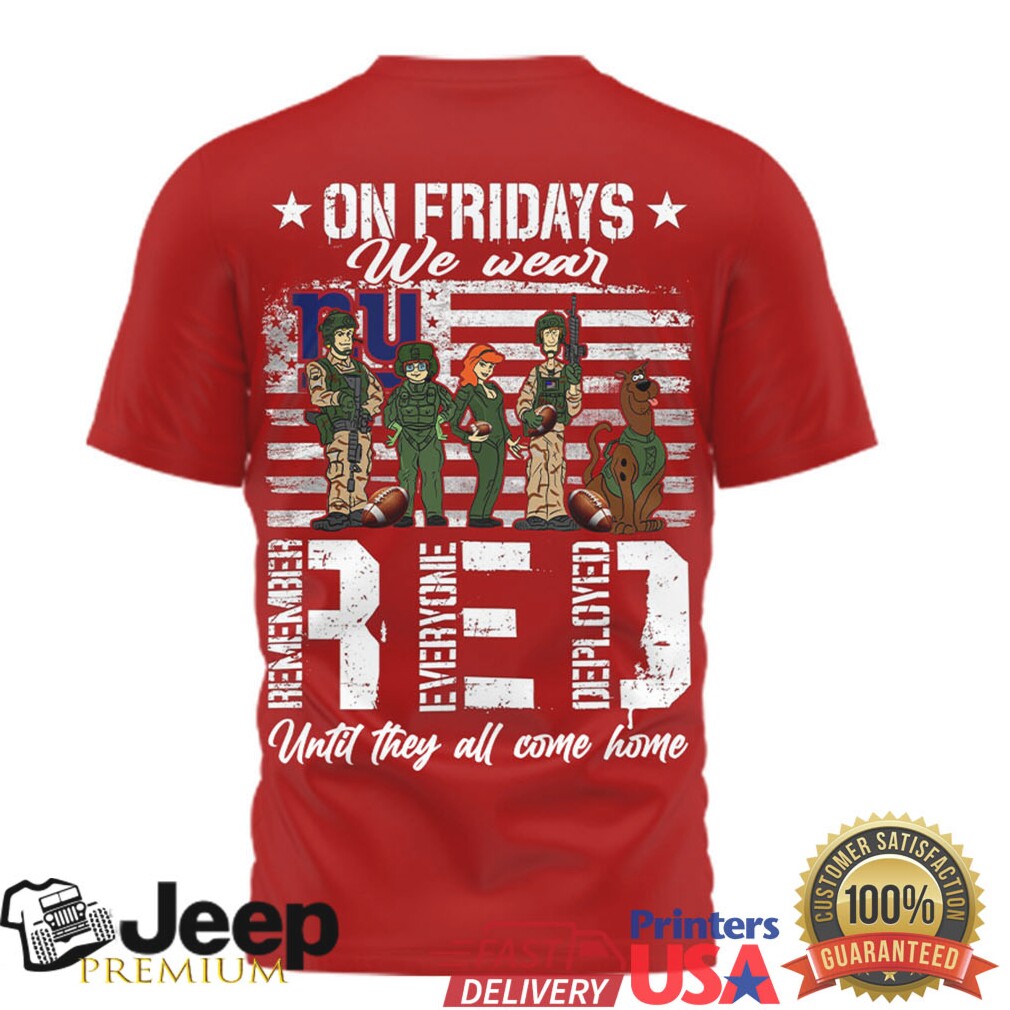 Honor our heroes every Friday with this New York Giants R.E.D. Friday T-Shirt — Remember Everyone Deployed. Show your support for the brave men and women serving in the U.S. military while repping your favorite team. Bold red design with patriotic messaging. Perfect for veterans, military families, and proud American football fans alike.