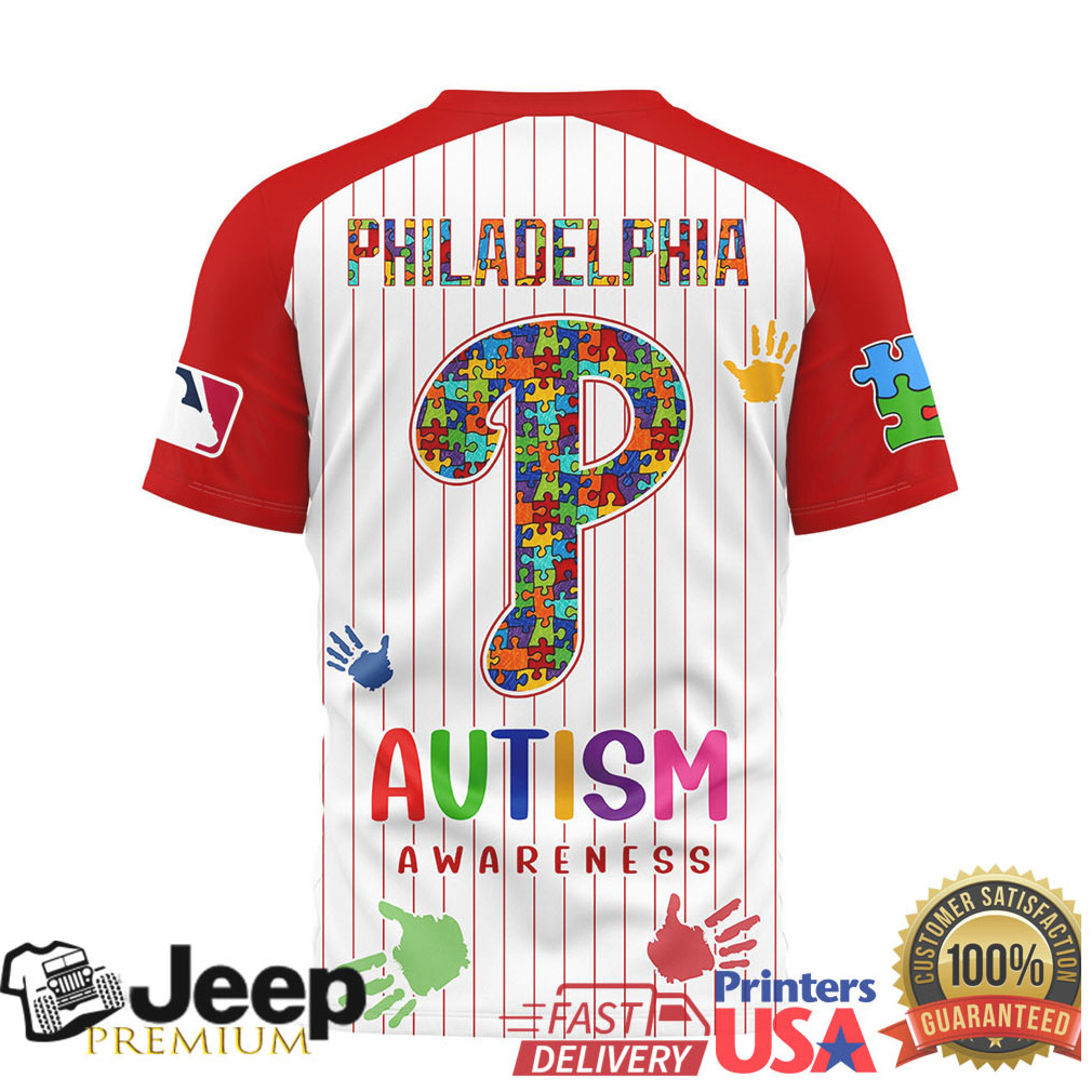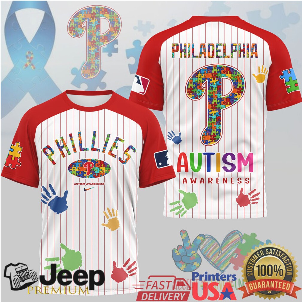 Show your support and team pride with this Philadelphia Phillies Pinstripe Baseball Autism Awareness tee. Featuring the beloved puzzle piece pattern in vibrant team colors, this shirt spreads awareness with style. A meaningful way to celebrate inclusivity while cheering on your favorite baseball team — wear it to the game and start a conversation that matters.