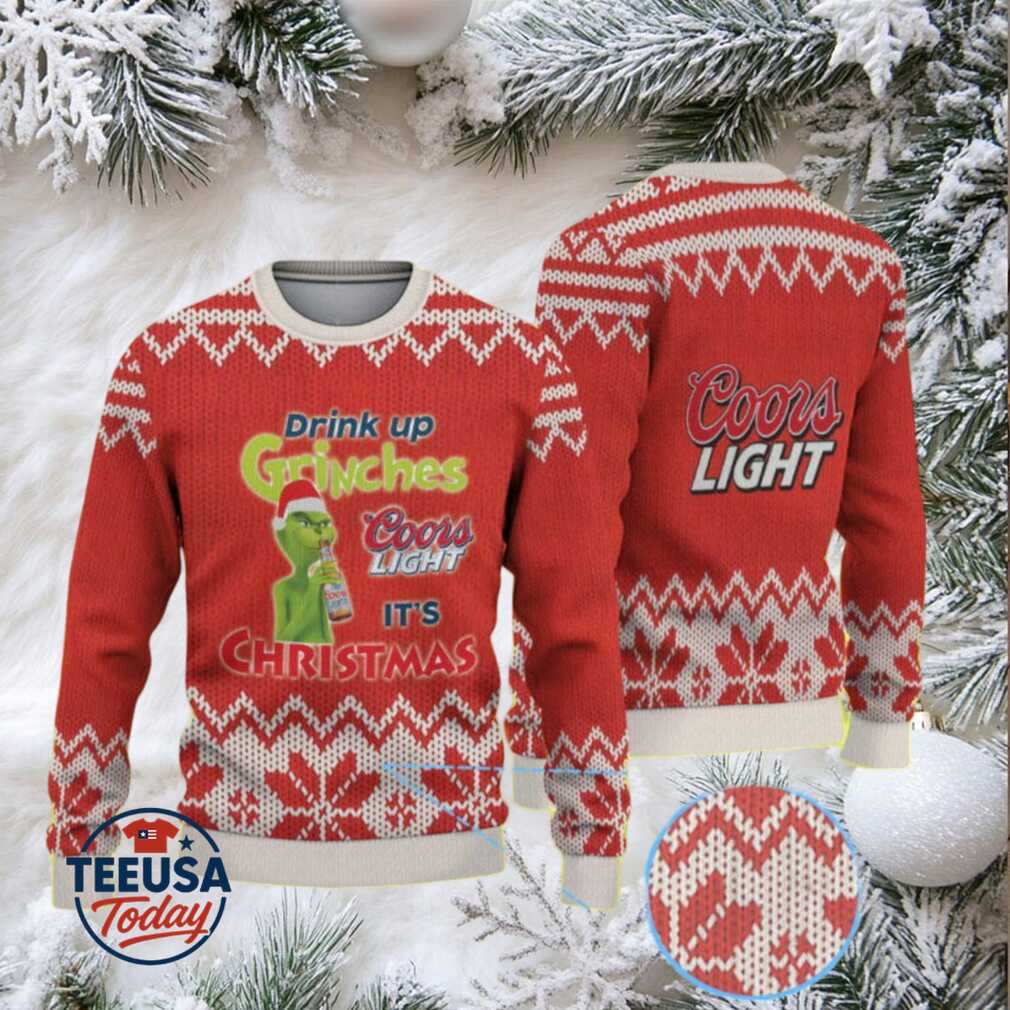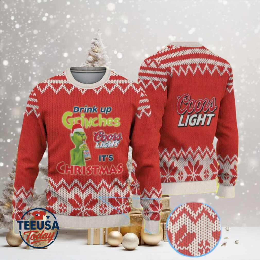 👕 About Red & White Knit Pattern “Drink Up Grinches – It’s Christmas” Coors Light Ugly Christmas Sweater.jfif