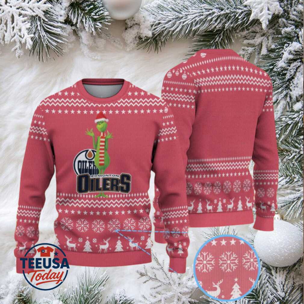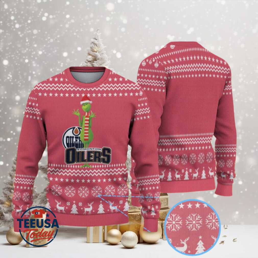 What Makes This Red & White Snowflake Knit Grinch Edmonton Oilers Logo Ugly Christmas Sweater Epic