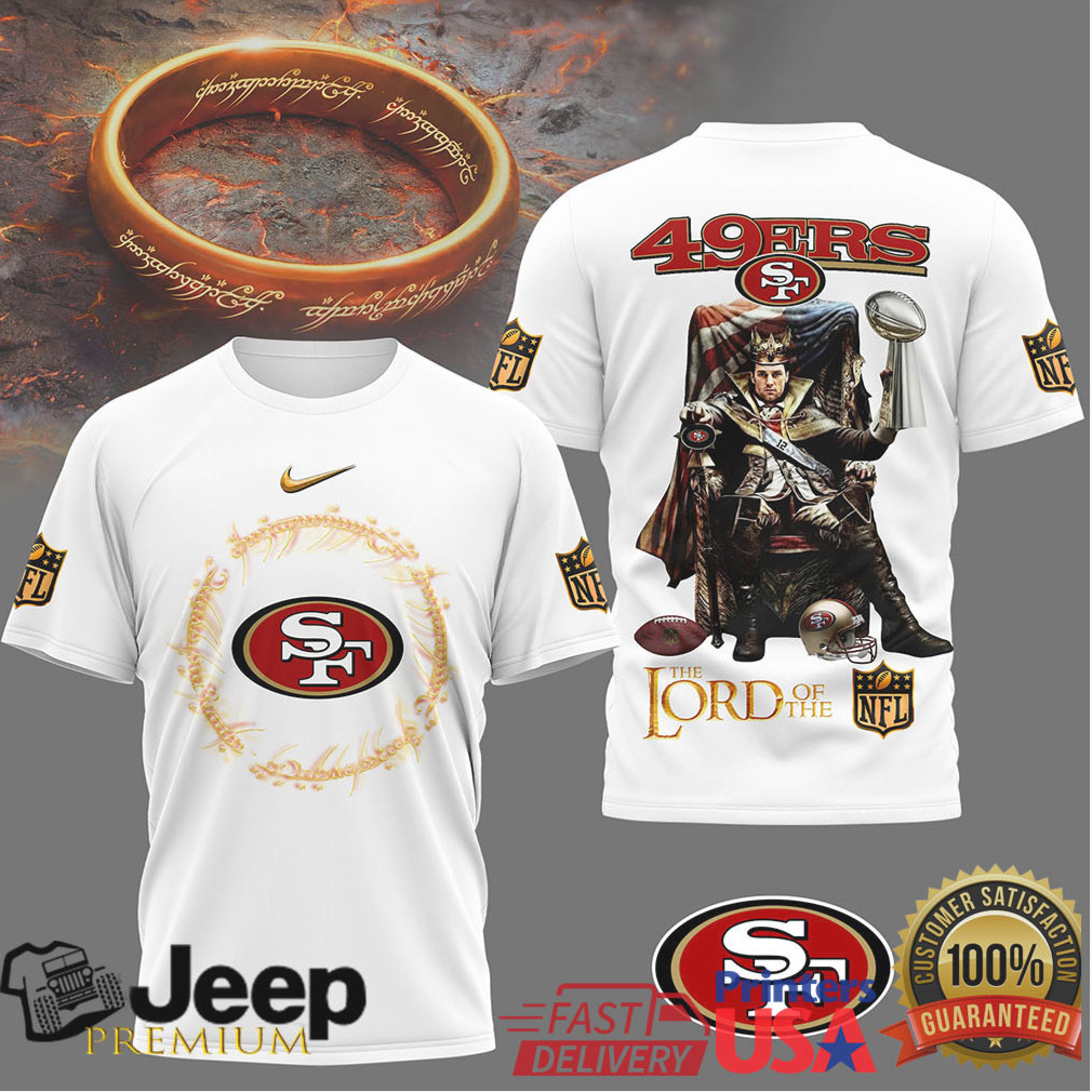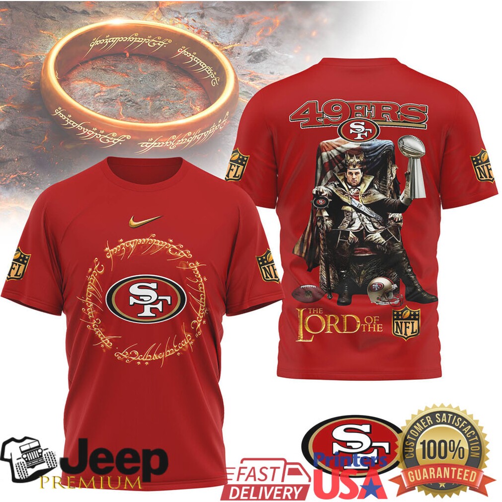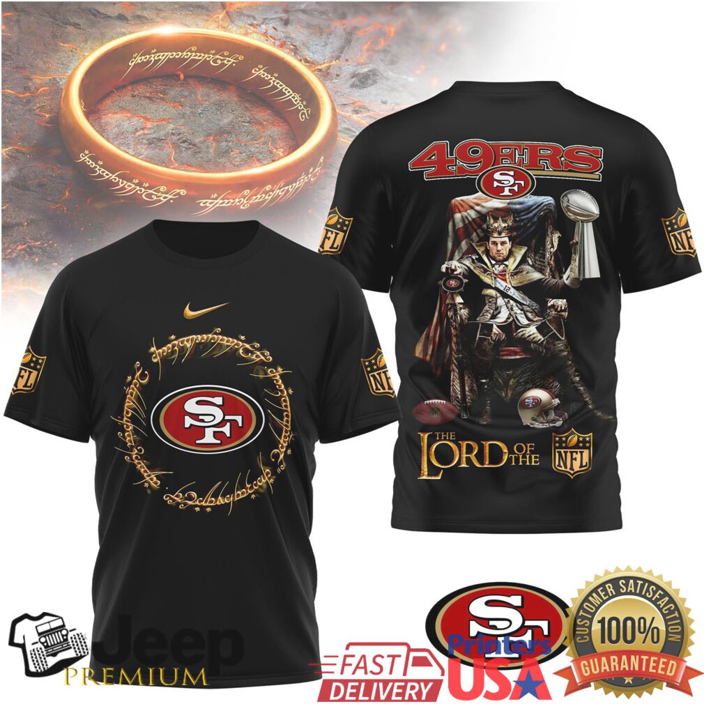 One team to rule them all! This epic San Francisco 49ers x Lord of the Rings mashup tee brings together the glory of Middle-earth and the passion of NFL football. Featuring a majestic fantasy-inspired throne design with San Francisco 49ers team branding, this shirt is a must-have for fans who love both gridiron battles and legendary quests. A bold statement piece for game days and beyond.
