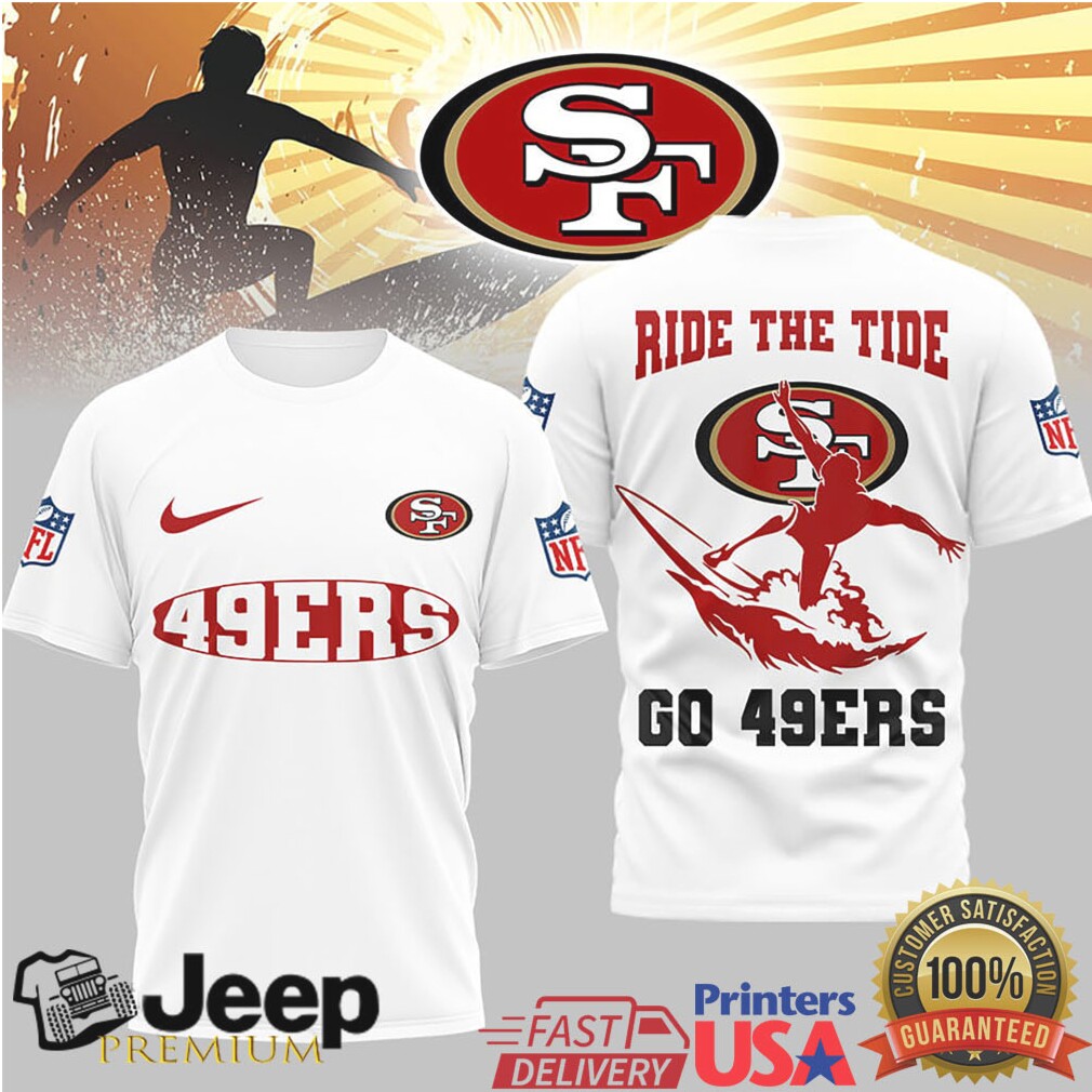 If you are seated and you are not being punched or hit with something if you drive up into osoto gari your hips are already much lower than the other person and when you drive up it San Francisco 49ers Official NFL Ride The Tide 3D Shirt the throw naturally due to the temporary height differences. It only works if you can get grips as you are standing without eating punches. The ballet entrance: A judo friend of mine in who was in my older olassical jujitsu school had a training session with a shoot fighter who used the ballet jump where the dancer does the front splits in the air for his entrace. We called it the ballet entrance. It worked because the jumping motion nailed the others feet to the ground and as you pass him it shifted his weight to the heel of the side you jumped on. If you are going to play with this be careful with your knees. (the person taking the technique -careful of knees). You can use a pivot step like boxers use. Maybe you are holding a wrist, sleeve arm or whatever. Usually if you pivot, most people will pivot too but after you pivot. That pivot motion that they do can create an entry point using their San Francisco 49ers Official NFL Ride The Tide 3D Shirt to help with the throw. If they don’t pivot with you this technique will not work.