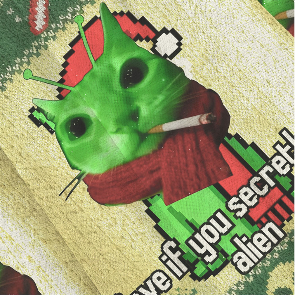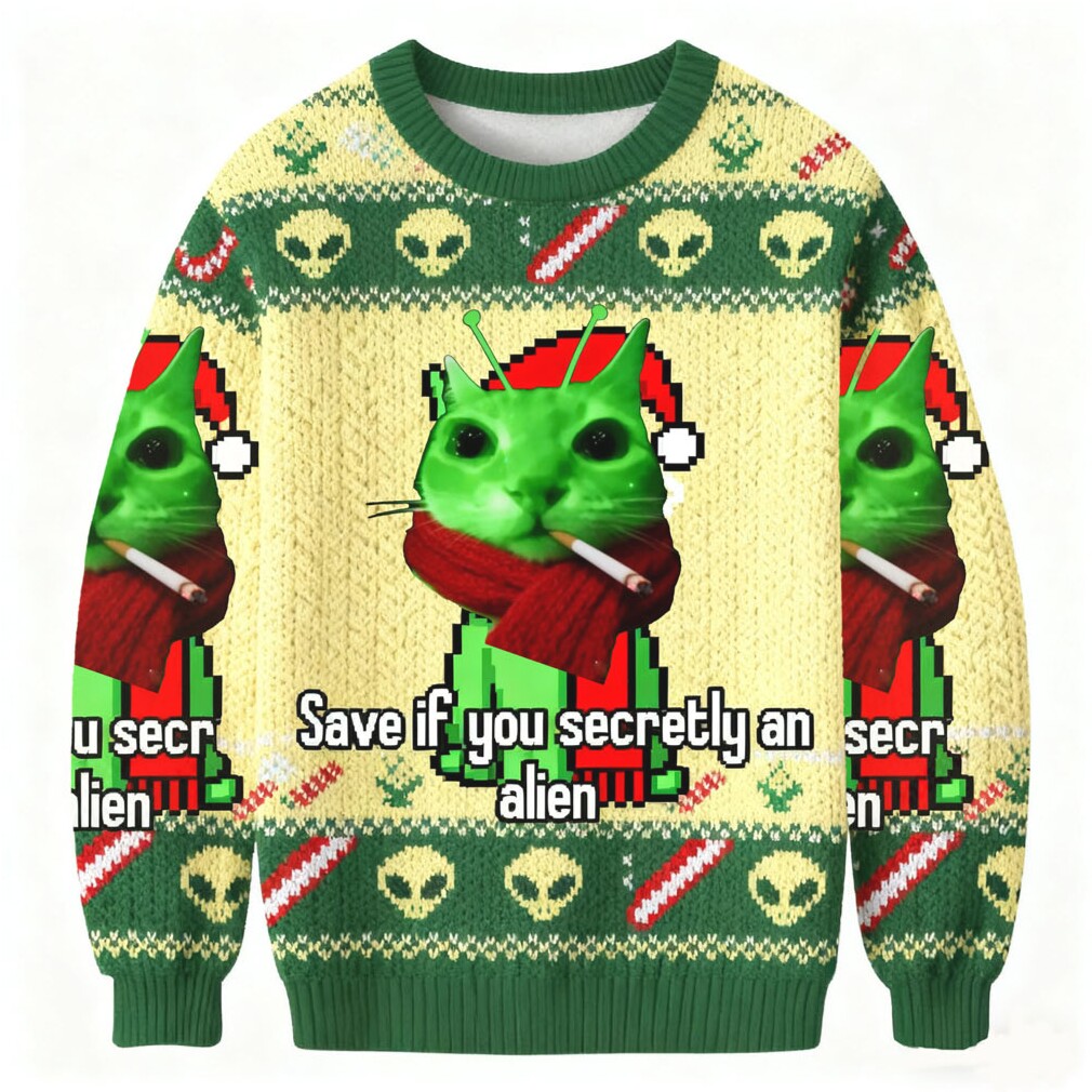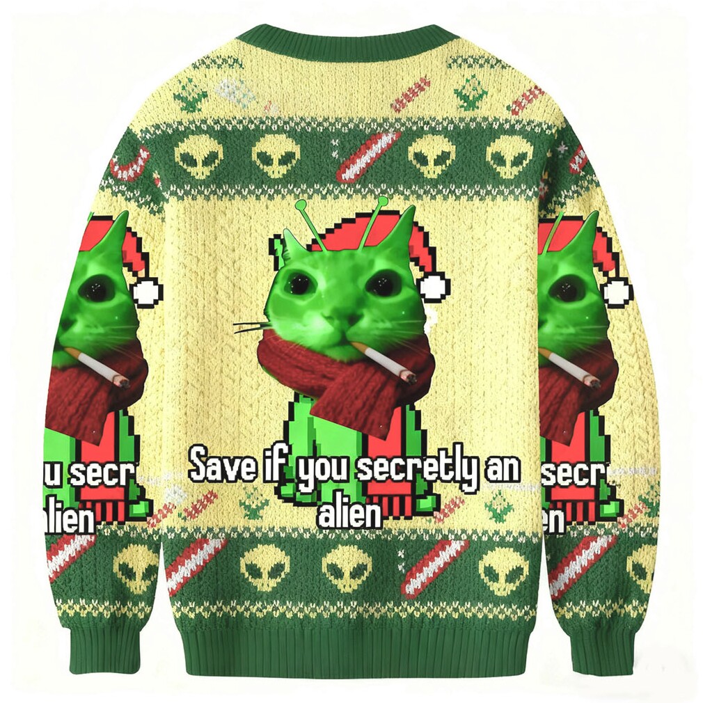 👕 About Save If You Secretly An Alien Smoing Cat Meme Christmas Ugly Sweatshirt