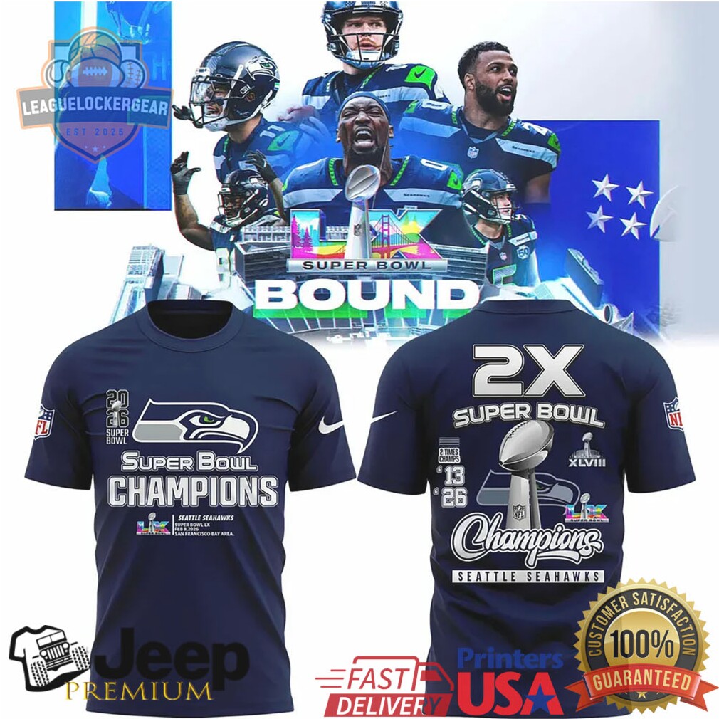 (Seattle Seahawks 2X Super Bowl Champions Navy Blue Fan T Shirt)