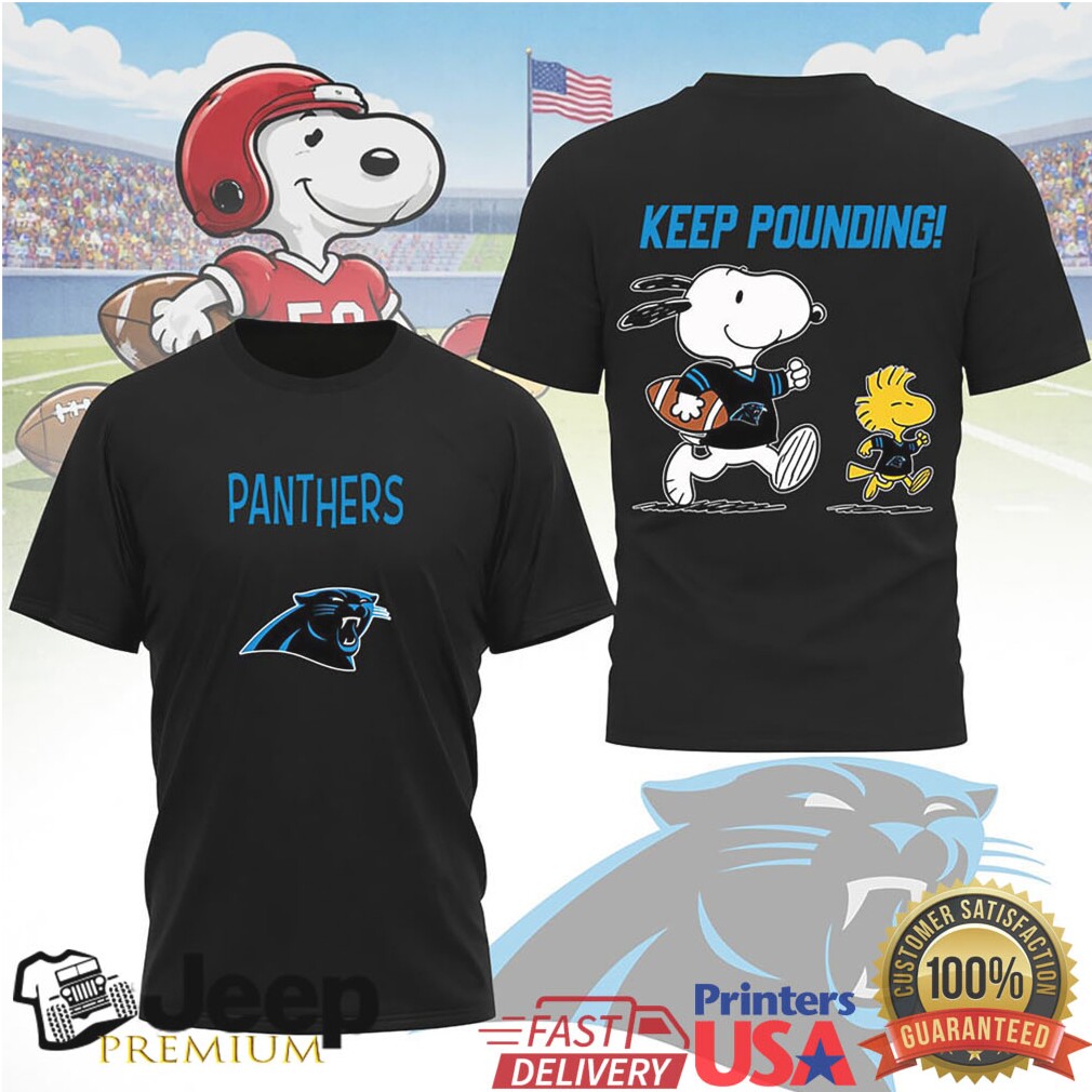 👕 About Snoopy Keep Pounding Carolina Panthers Peanuts Fan Black T Shirt