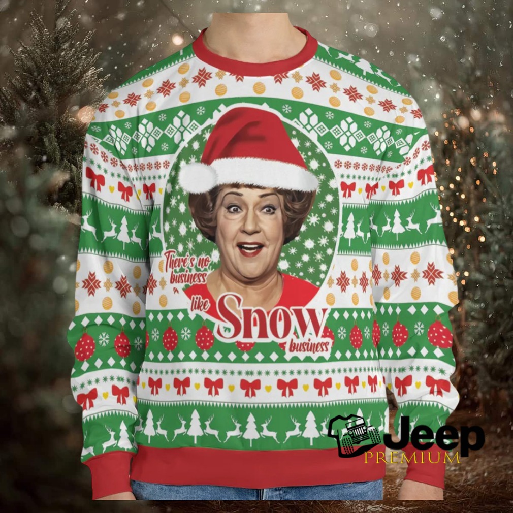 This sweatshirt is a perfect fit for movie buffs, theater lovers, and anyone with a great sense of humor who enjoys making a statement during the holiday season. It’s an ideal gift for a friend or family member who appreciates witty apparel and wants to bring a touch of old Hollywood charm to their Christmas celebrations. Wear it to an ugly sweater contest, a casual family gathering, or even while decorating the tree. The second image provides a detailed look at the festive yet funny aesthetic that makes this “There’s No business” sweatshirt a holiday essential for those who dare to be different.