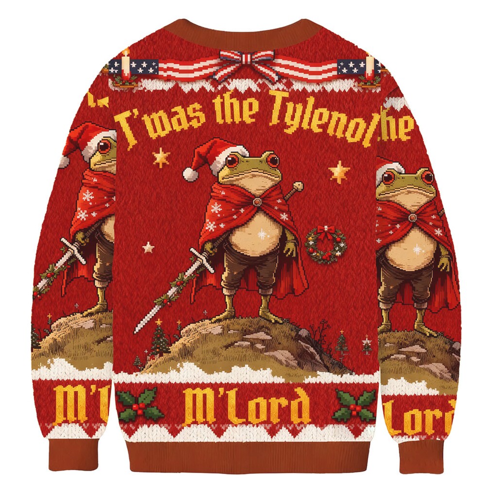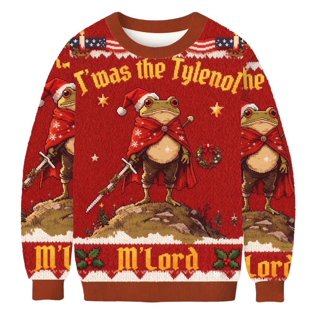 This “Twas The Tylenol M’Lord Funny Frog Christmas Sweatshirt” is more than just an ugly sweater; it’s a conversation starter and a badge of honor for internet aficionados. It solves the problem of blending in with boring holiday attire by offering a design that’s both recognizable to meme lovers and utterly confusing to everyone else. Imagine the reactions as you confidently rock this at your next Christmas gathering! The comfortable cotton blend ensures you stay cozy while spreading your unique brand of holiday cheer. Available in various sizes, it offers a great fit for everyone.
