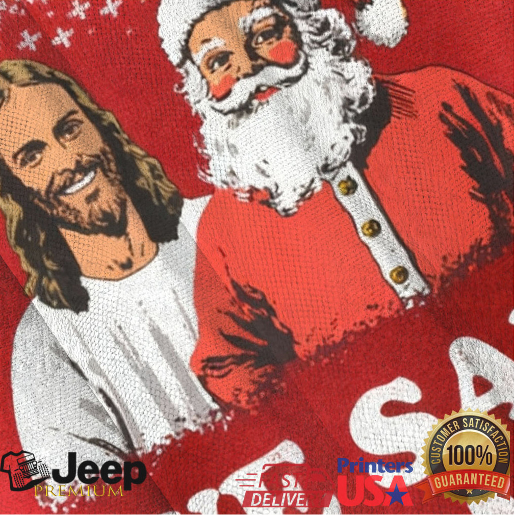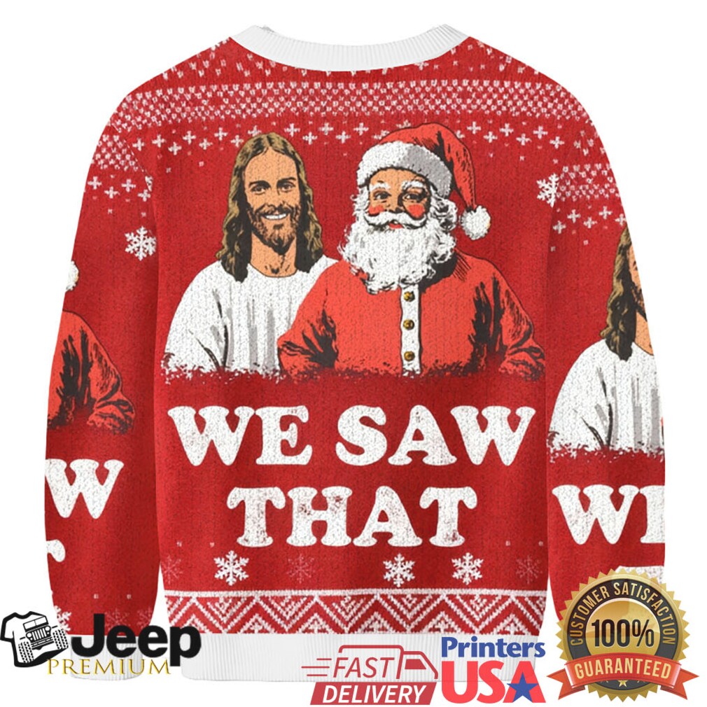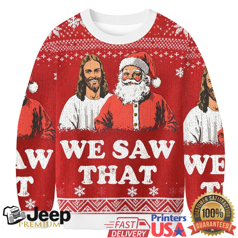 👕 About We Saw That Jesus And Santa Christmas Ugly Sweatshirt
