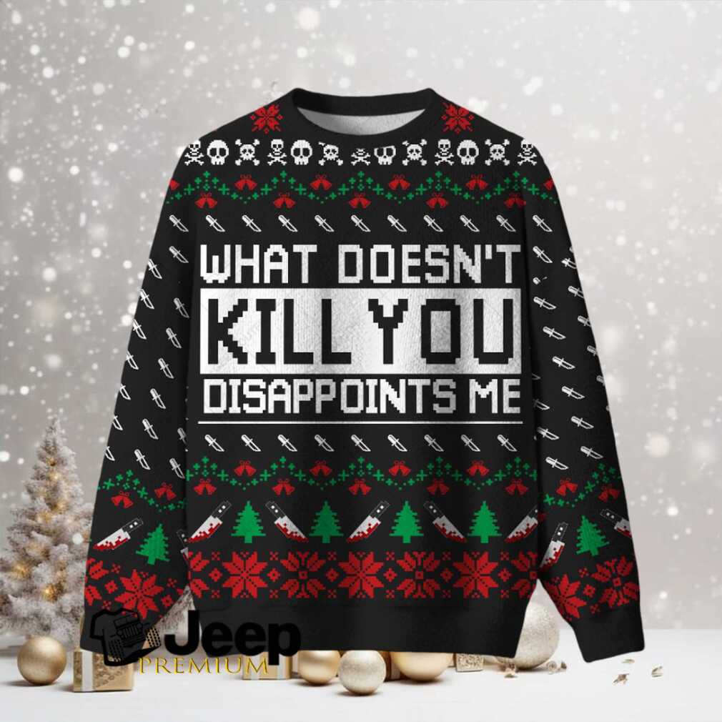 Step into ultimate comfort with this unique funny Christmas sweatshirt. Crafted from a wonderfully soft and fuzzy fleece material, it’s designed to keep you warm and snug, whether you’re celebrating at home or braving the winter chill. The bold, expressive text ‘What Doesn’t Kill You Disappoints Me’ stands out against a festive backdrop, making it a truly original piece. It offers a relaxed fit, making it easy to layer and wear for any casual occasion. This humorous Christmas fleece solves the dilemma of finding holiday attire that genuinely reflects your personality, ensuring you’ll never settle for a dull sweater again.