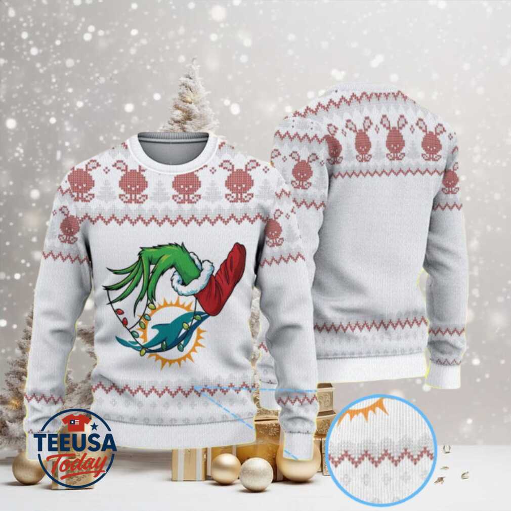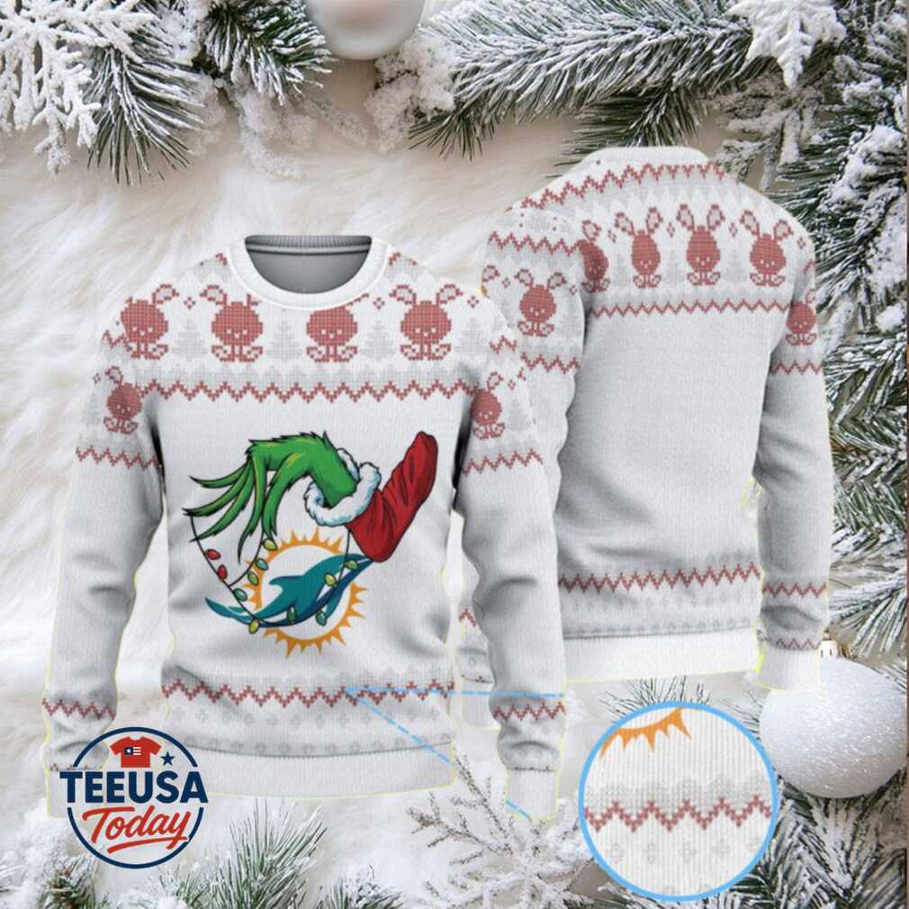 👕 About White and Red Pixel Pattern “Grinch Hand Miami Dolphins Logo” Ugly Christmas Sweater.jfif