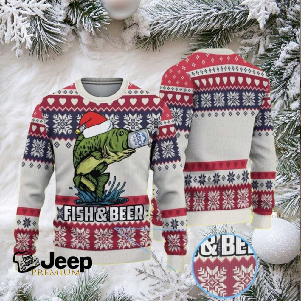 π About White Red Blue Ugly Christmas Sweater with Snowflake and Heart Pattern, Fish & Beer Theme Featuring Busch Light Can.jfif