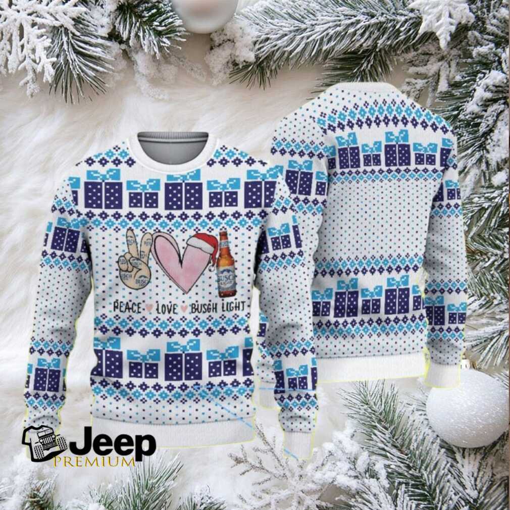 👕 About White Ugly Christmas Sweater with Blue Gift Box Pattern, Peace Love and Busch Light Beer Design.jfif