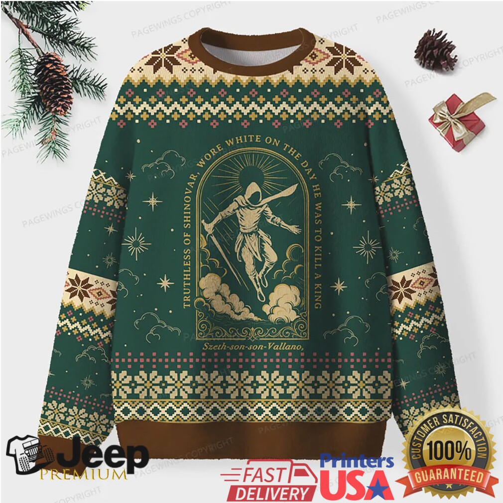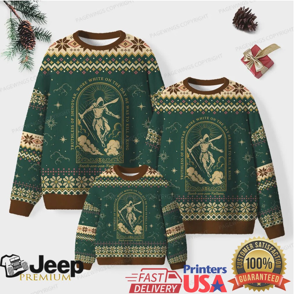 This “Wore White On The Day He Was To Kill A King Unisex Ugly Knit Sweatshirt” features a clever design that subtly references a famous fantasy quote, making it an instant conversation starter. It’s the ultimate statement piece for anyone tired of generic holiday wear, solving the problem of blending in when you were born to stand out. Crafted from a soft, cozy knit blend, this sweatshirt ensures warmth and comfort, whether you’re at a holiday feast or simply plotting your next move on the couch. Its unisex design offers a relaxed fit for all body types. Take a closer look at the striking imagery, perfectly capturing the spirit of winter and a legendary tale.