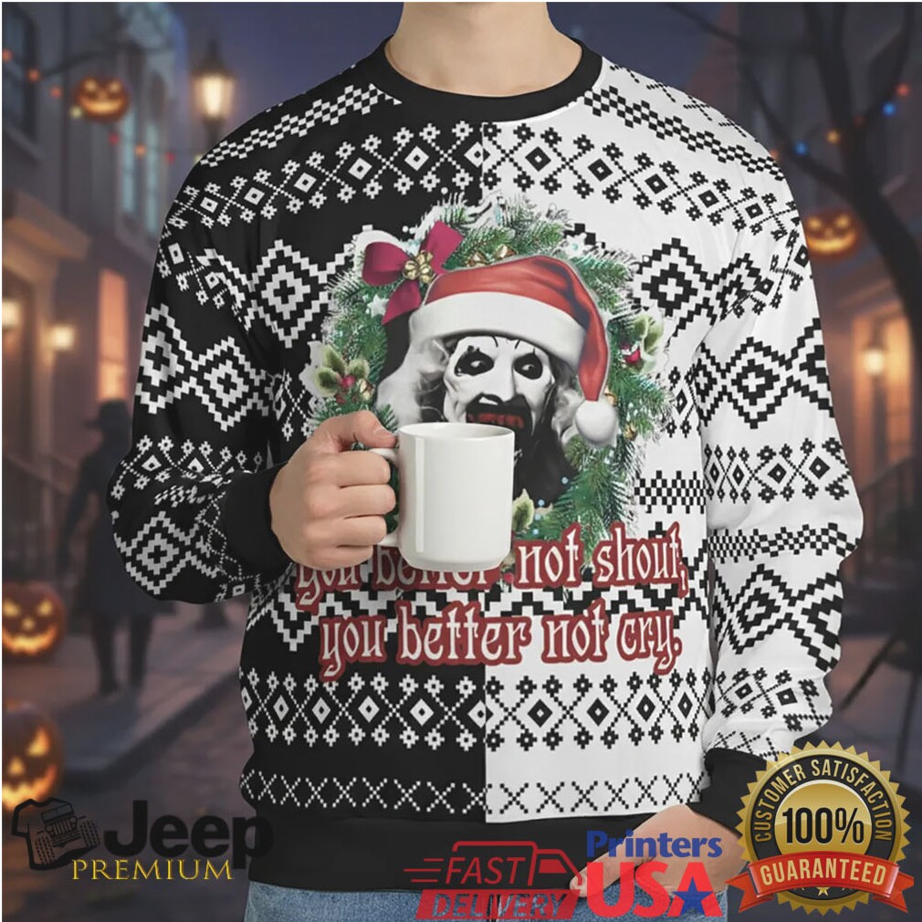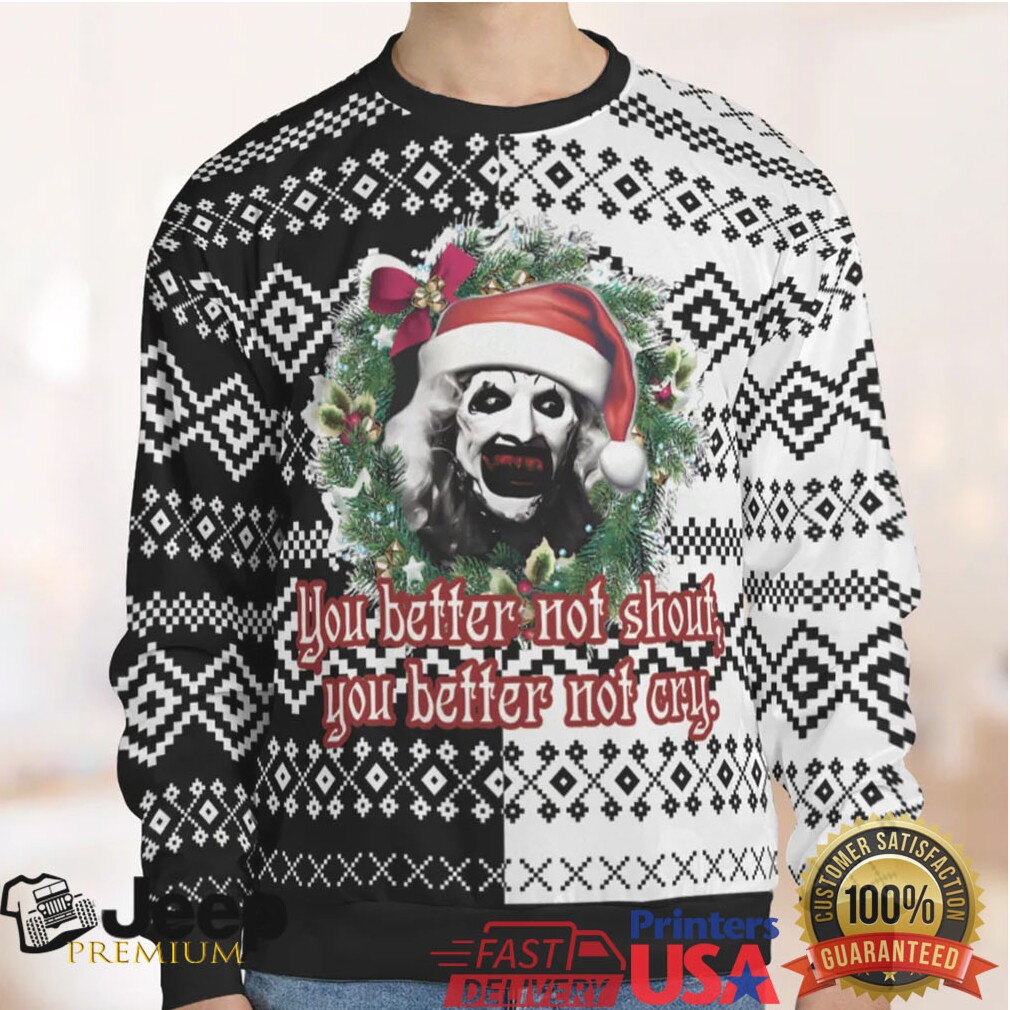 The ‘You better not shout, you better not cry Terrifier Ugly Christmas Sweatshirt’ is a must-have for devoted Terrifier fans, horror movie enthusiasts, and anyone who loves to inject a bit of dark humor into their holiday wardrobe. Wear it to an ugly Christmas sweater contest and guarantee a win (or at least the most memorable outfit). It’s also an unexpected and awesome gift for that friend who binges horror films all year long. Imagine their delight unboxing this unique piece! Perfect for casual wear, movie nights, or making a bold statement at any holiday event, this horror Christmas sweatshirt will be the highlight. Check out how it looks, ready to make a chilling impression.